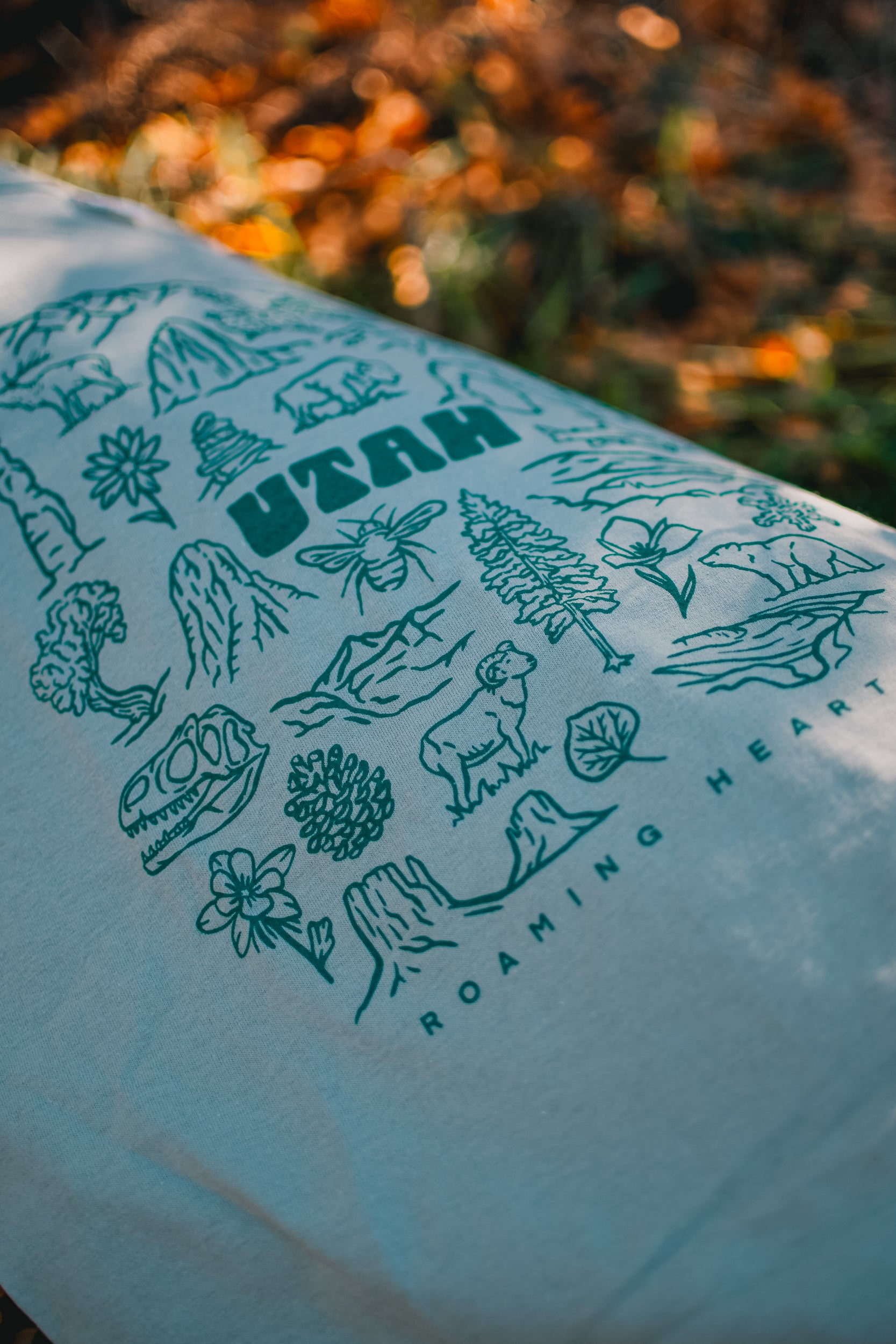 From red rock arches to alpine peaks, this short sleeve tee celebrates what makes Utah unforgettable. The front features a lineup of original icons, each designed to represent a distinct part of the state’s diverse landscapes and culture. Made with 100% cotton and standard unisex sizing, it’s and ready for wherever the road (or trail) takes you.