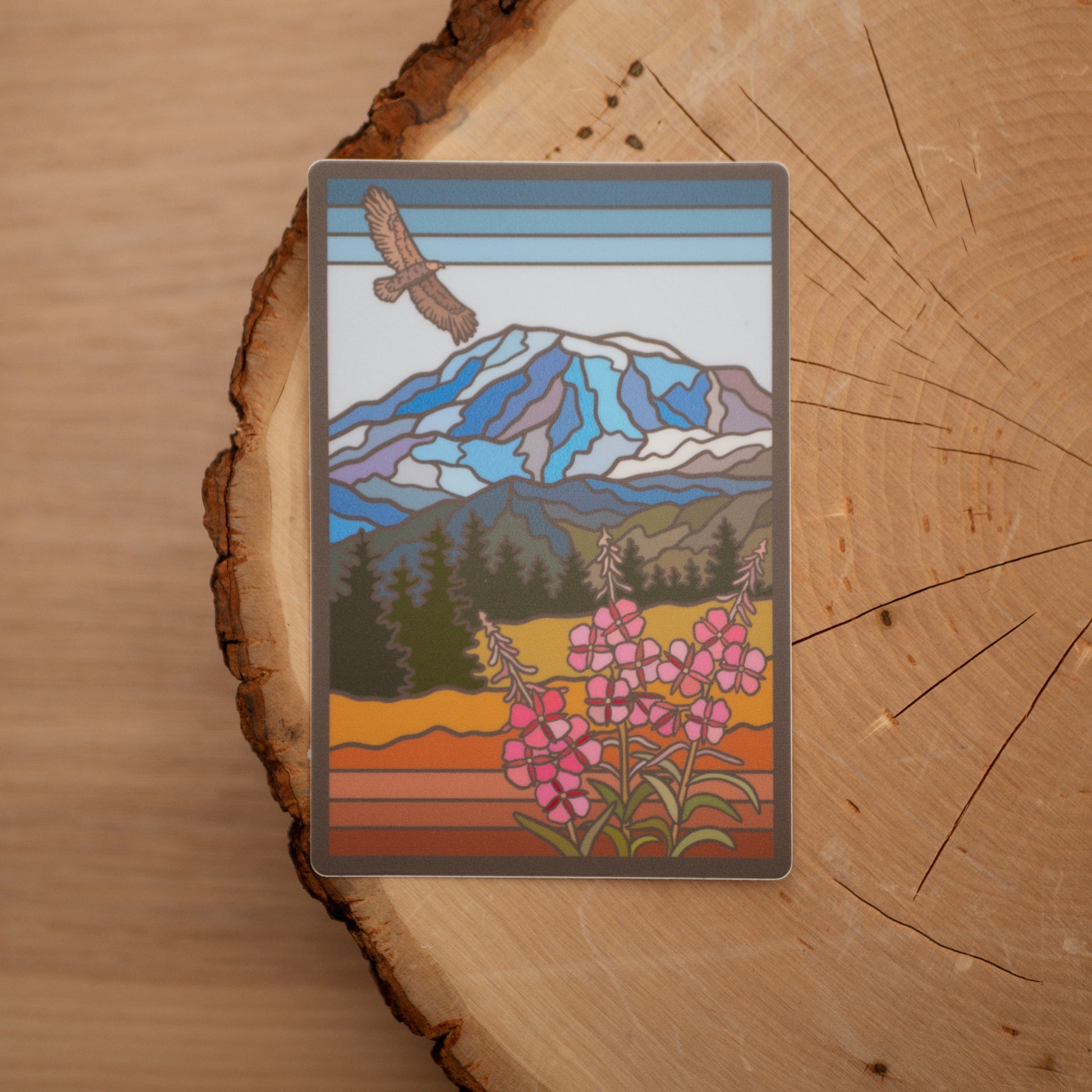Capture the grandeur of North America’s tallest peak with this design featuring Denali’s rugged silhouette towering above a pristine alpine lake. Majestic golden eagles soar overhead, symbolizing the strength and freedom of the Alaska Range, while vibrant pink fireweed blooms in the foreground, echoing the park’s summer splendor. Designed with deep, rich tones and a subtle retro style, this sticker evokes the wild, untamed spirit of Denali.