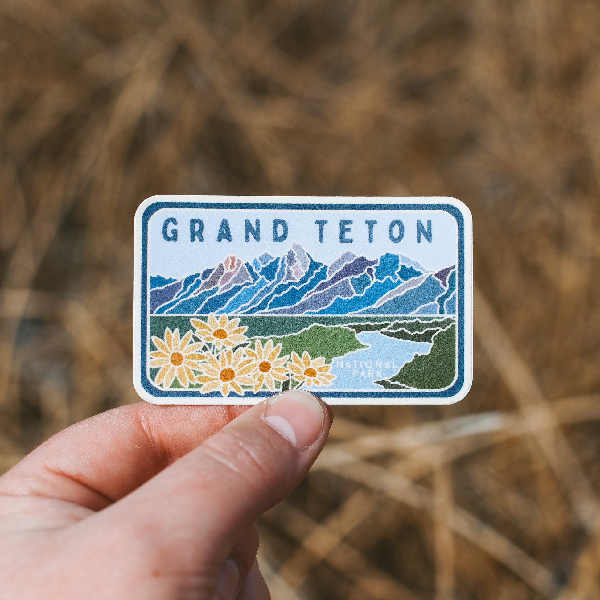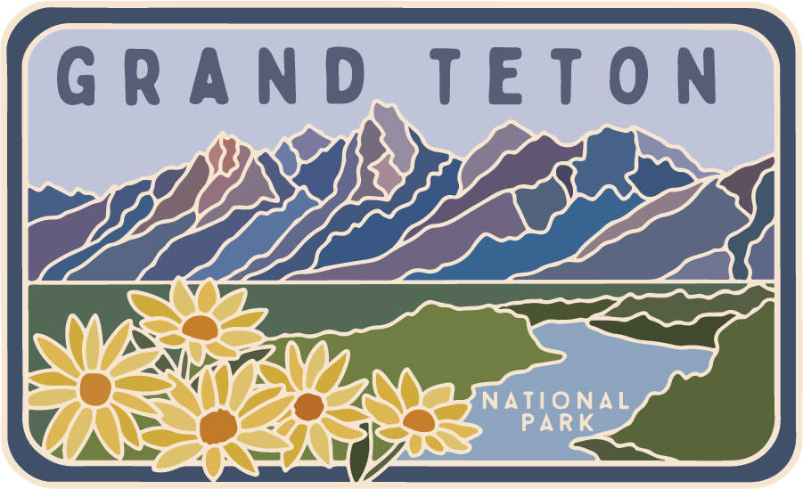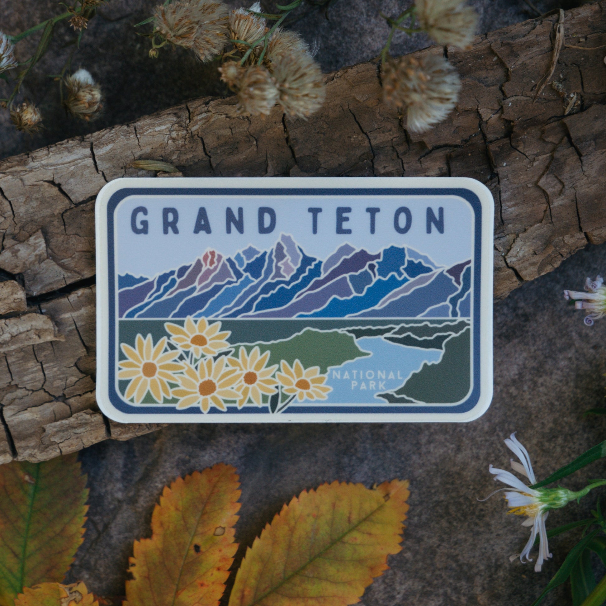 Inspired by classic road trip nostalgia, this sticker features a license plate-style design that highlights the winding rivers, delicate wildflowers, and jagged peaks of Grand Teton. With colors and details that reflect the character of the park, it’s a fun and durable way to commemorate your visit—or inspire your next one.