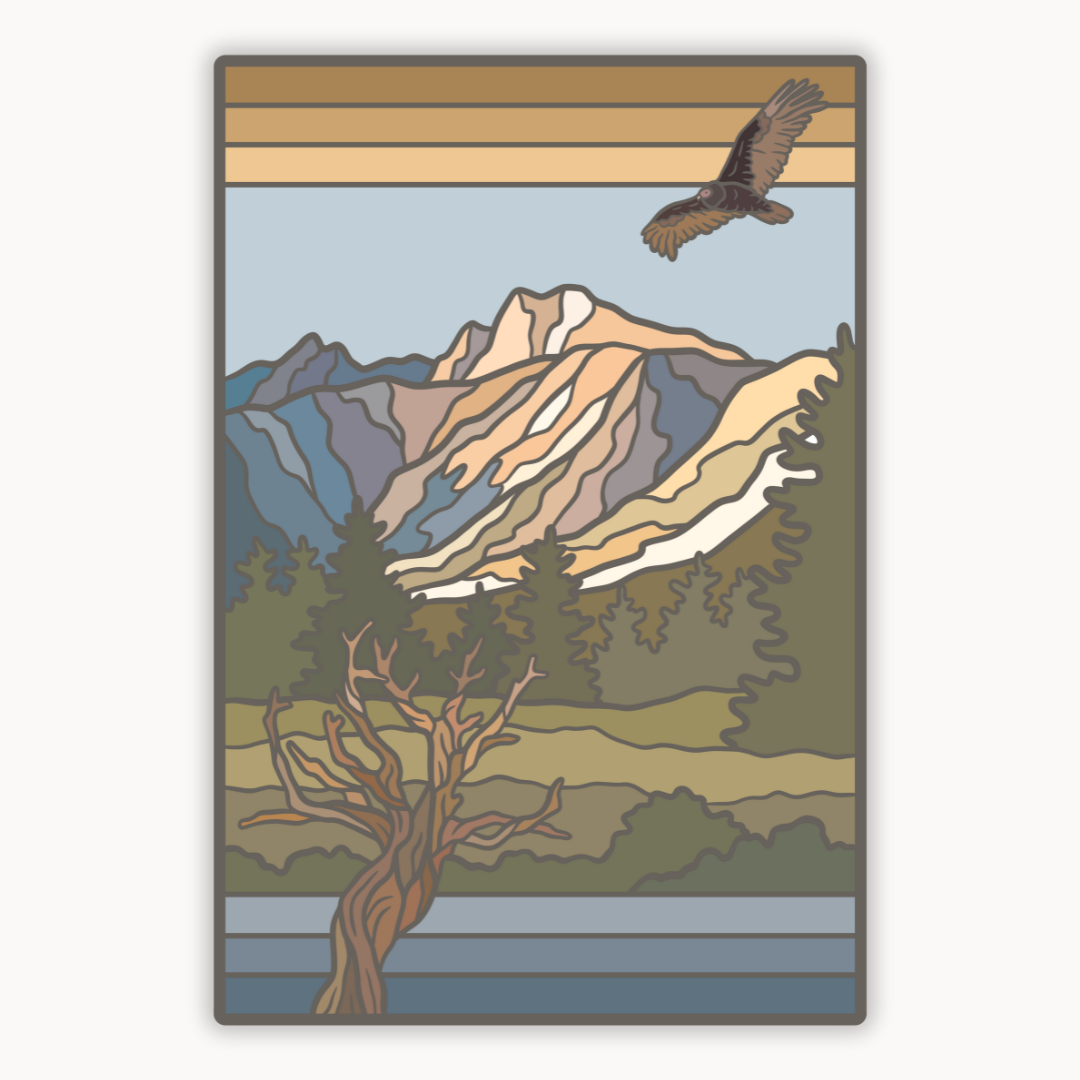 Celebrate the quiet beauty of Nevada’s high desert with this design featuring the weathered trunk of a bristlecone pine—one of the oldest living trees on Earth—set against the backdrop of Wheeler Peak. Overhead, a golden eagle soars through the open sky, capturing the sense of space and freedom that defines Great Basin. With rich earth tones and a subtle retro aesthetic, this design highlights the resilience and beauty of this lesser-known gem.