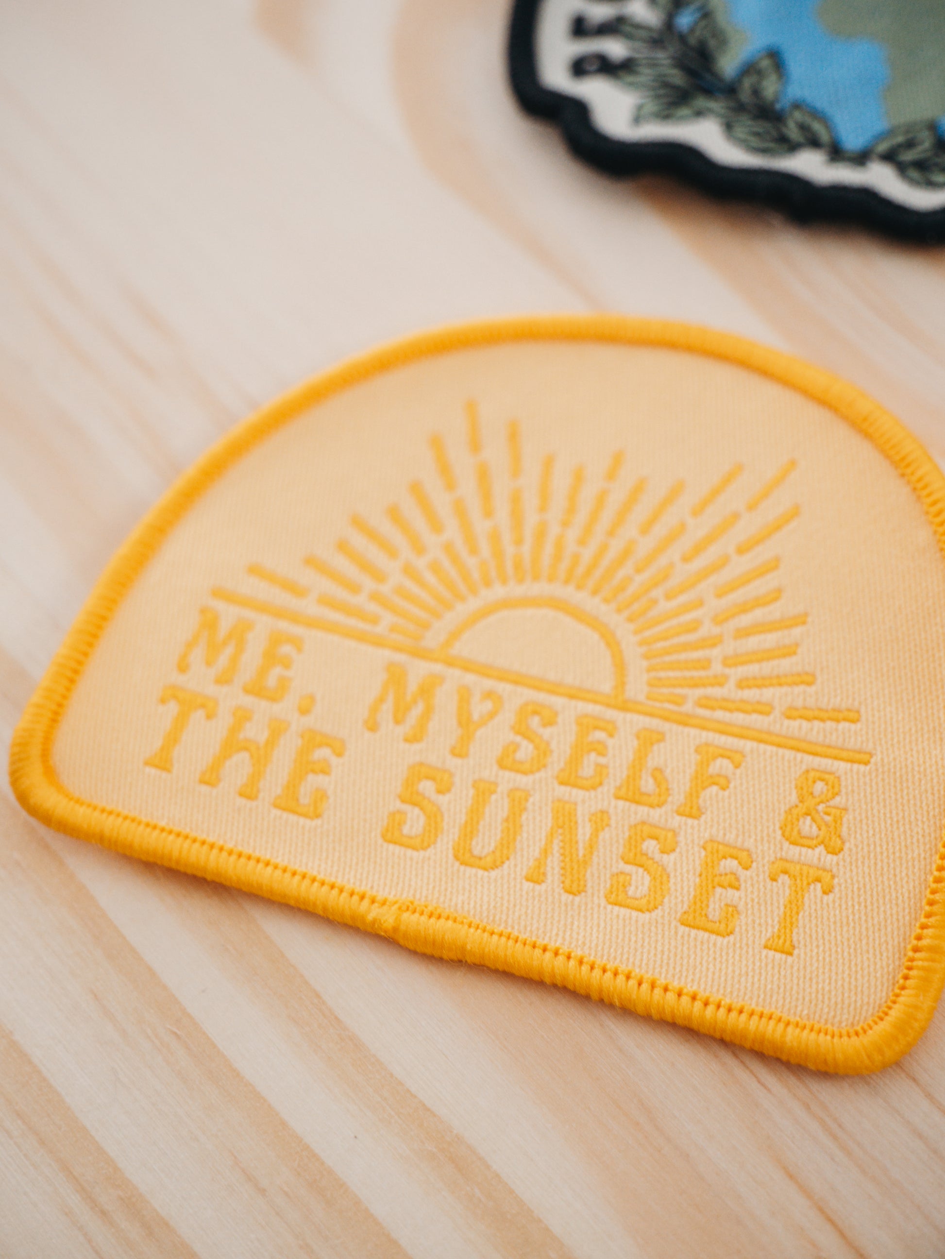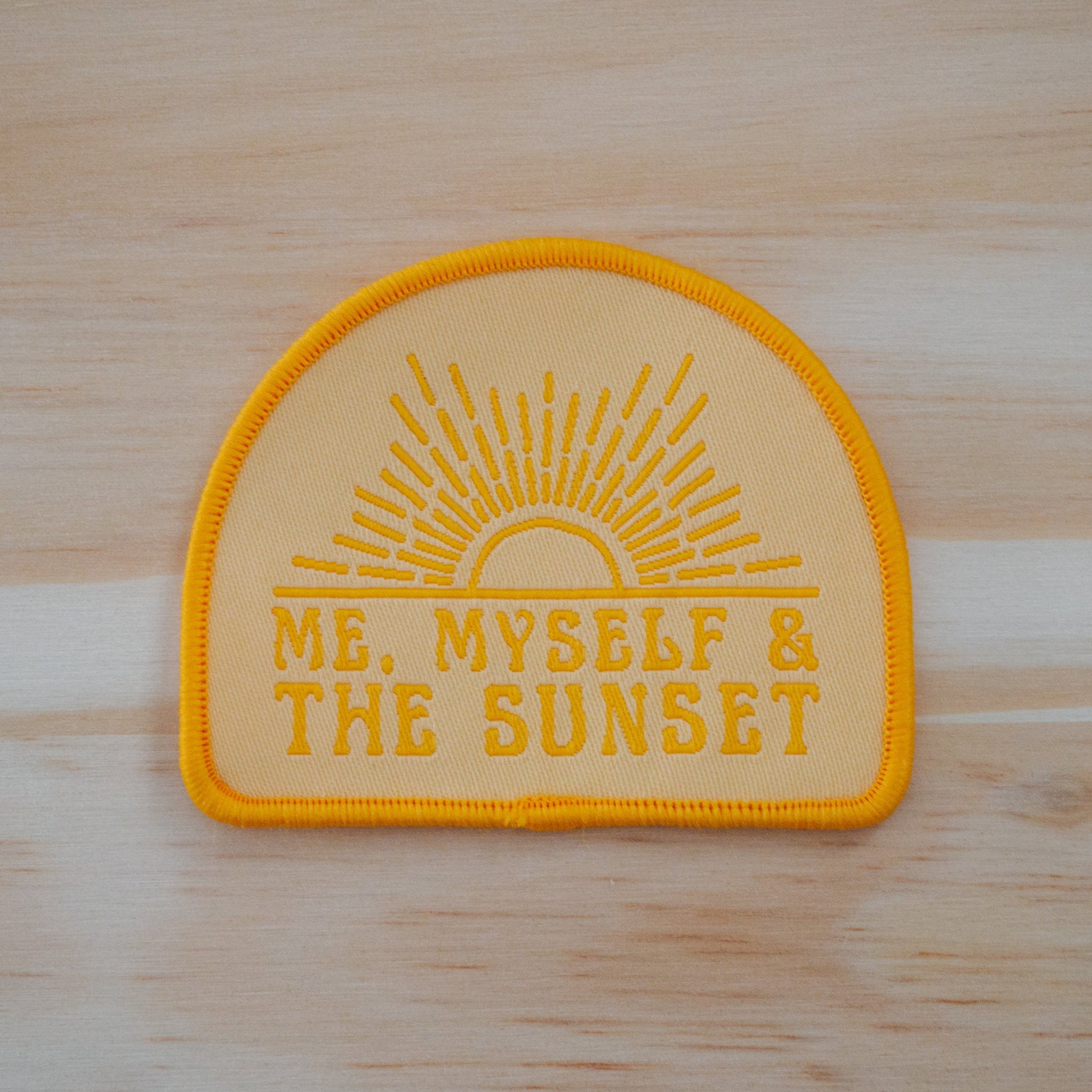 Bold, bright, and made for golden hour. This patch features the phrase “Me, Myself, and the Sunset” in warm yellow and orange lettering, with a glowing sun and rays above. It's a reminder to enjoy your own company and soak in the quiet beauty of the moment—wherever the sun finds you.